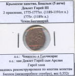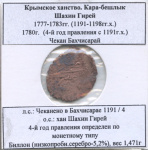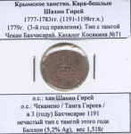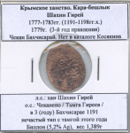 Крымское ханство. Кара-бешлык Шахин Гирей (1777−1783гг.) 1779 г (3-й год правления с 1191 г.х.). Чекан Бахчисарай. Биллон (5,2% Ag), вес 1,30 г, л.с.: хан Шахин Гирей, о.с.: Чеканено в Бахчисарае 1191/3, 3-й год правления определен по монетному типу. Билл»» Ag 6 greenland 6
