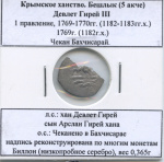 Крымское ханство. Бешлык (5 акче). Девлет Гирей III, 1 правление, 1769−1770гг. (1182−1183 гг.х.) 1769 г. (1182г.х.) Чекан Бахчисарай. л.с.: хан Девлет Гирей сын Арслан Гирей хана, о.с.: Чеканено в Бахчисарае, надпись реконструирована по многим монетам. Би»» Ag 8 greenland 8