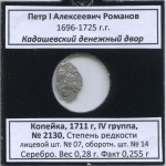 1 копейка. Петр І Алексеевич Романов 1696—1725 гг. г. Кадашевский денежный двор, 1711 г, IV группа, № 2130, Степень редкости лицевой шт. № 07, оборотн. шт. № 14 Серебро. Вес 0,28 г. Факт 0,255 г 1711. В холдере