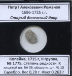 1 копейка. Петр І Алексеевич Романов 1696—1725 гг. г. Старый денежный двор, 1715 г, ІІ группа, № 1775, Степень редкости ІХ, лицевой шт. № 09, оборотн. шт. № 10. Серебро. Вес 0,28 г. Факт 0,263 г 1715. В холдере