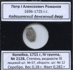 1 копейка. Петр І Алексеевич Романов 1696—1725 гг. г. Кадашевский денежный двор, 1711 г, IV группа, № 2128, Степень редкости ІХ лицевой шт. № 07, оборотн. шт. № 12. Серебро. Вес 0,28 г. Факт 0,282 г 1711. В холдере