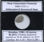 1 копейка — Петр і Алексеевич Романов 1696—1725 гг. г. Кадашевский денежный двор, 1708 г, III группа, № 2075, Степень редкости лицевой шт. № 44, оборотн. шт. № 97. Серебро. Вес 0,28 г. Факт 0,289 г 1708. В холдере