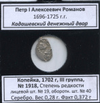 1 копейка. Петр І Алексеевич Романов 1696—1725 гг. г. Кадашевский денежный двор, 1702 г, III группа, № 1918, Степень редкости лицевой шт. № 19, оборотн. шт. № 40. Серебро. Вес 0,28 г. Факт 0,372 г 1702. В холдере