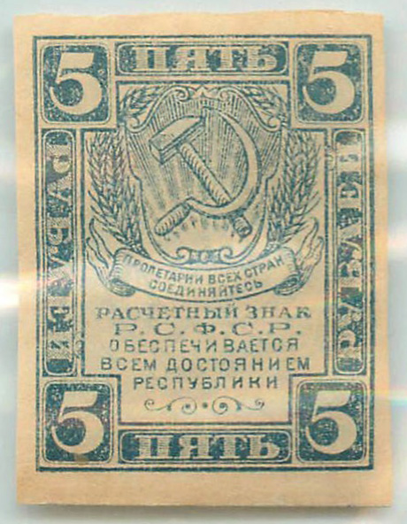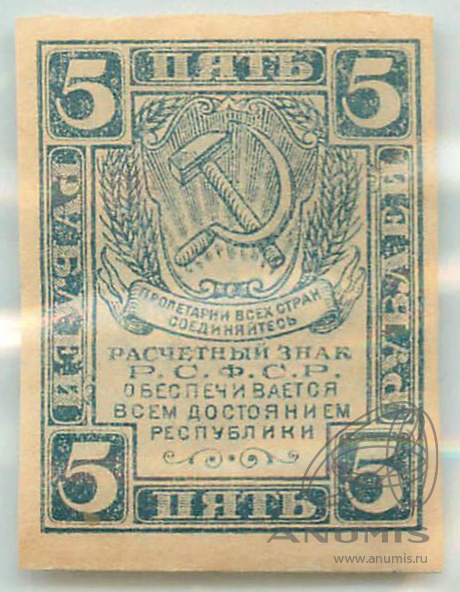 Банкнота регулярного выпуска: 5 рублей 1920 года. Расчетные знаки РСФСР 1920 г. Российская Советская Федеративная Социалистическая Республика: РСФСР (1919 — 1923).