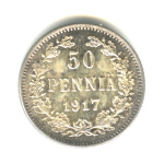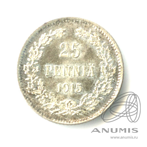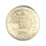 Монета регионального выпуска: 25 пенни 1915 года «Для Финляндии». 25 пенни 1865 — 1917 гг. Российская Империя: Николай II (1894 — 1917). Серебро 750, 1 г, ø 16 мм, Гурт: Рубчатый. Тираж: 2400000 шт.