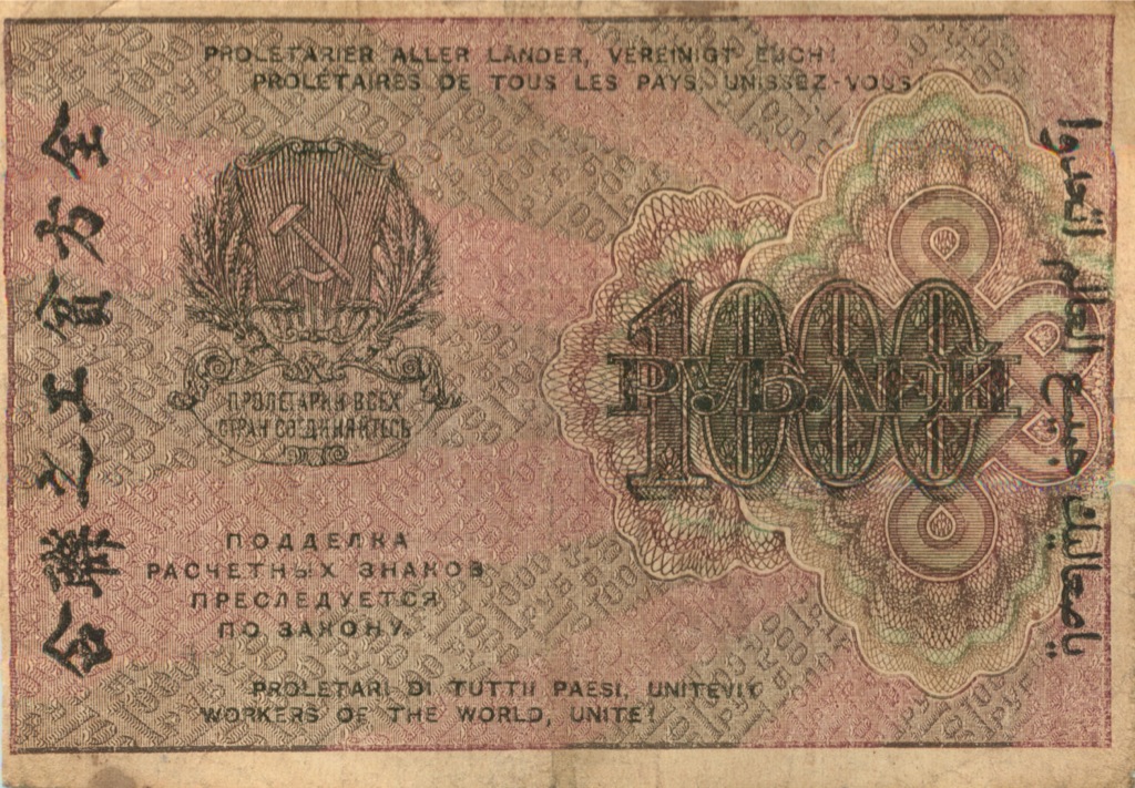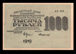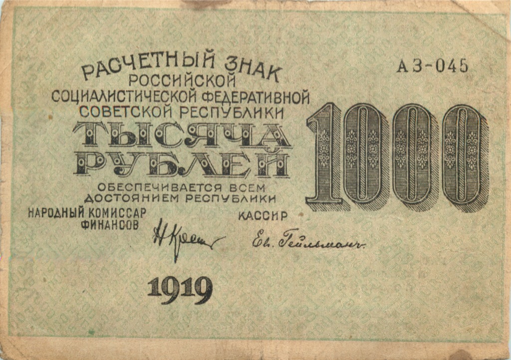 Банкнота регулярного выпуска: 1000 рублей 1919 года «ком. Крестинский. Гейльман». Расчетные знаки РСФСР 1919 г. «Совзнаки». Российская Советская Федеративная Социалистическая Республика: РСФСР (1919 — 1923).